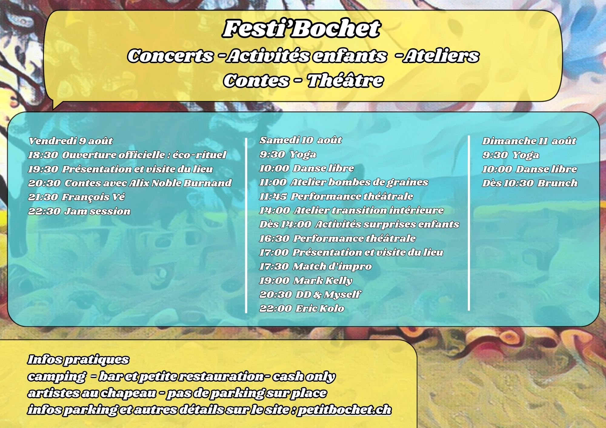 Le Festi’bochet est un festival qui tend à inclure tant les familles que celles et ceux sans enfant. Il y aura des temps spécialement pour adultes, certains pour les enfants (samedi en journée) et d’autres mélangeant toutes les générations.